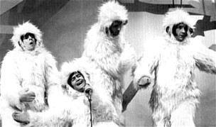 After The Monkees perform "Wind Up Man" in the stiff-legged form of robots, and "I Go Ape" disguised in white gorilla costumes, they are regenerated to Darwin's taste and, hypnotized, plasticized, psychoanalyzed, and sterilized, they make their debut at the Paramount Theater on December 7, 1956, dubbed "the greatest rock 'n' roll singers in the world." The four, dressed in outlandish 1950s vocal group gear, are then immediately launched into a classic '50s rock medley: "At The Hop," "Little Darlin'," "Peppermint Twist," and more. Backing them up are Jerry Lee Lewis, Little Richard, The Buddy Miles Express, and The Clara Ward Singers. Brian Auger and Julie Driscoll interrupts the proceedings and announces they have decided to give David, Micky, Michael and Peter complete and total freedom, resulting in a brief snippet of David Jones' "String For My Kite," Peter Tork's harpsichpord rendition of "Solfeggietto" by C.P.E. Bach and all four Monkees performing "Listen To The Band," with Michael on Black Beauty (Gibson Les Paul Custom), Peter on keyboards, Micky on drums, and David on tambourine as an affectionate swan song performance by all four Monkees. As the song progresses, they are joined by hippies and all of 33 1/3 Revolutions Per Monkee's guest musicians from The Trinity to The Buddy Miles Express, resulting in a climactic frantic cacophony.
